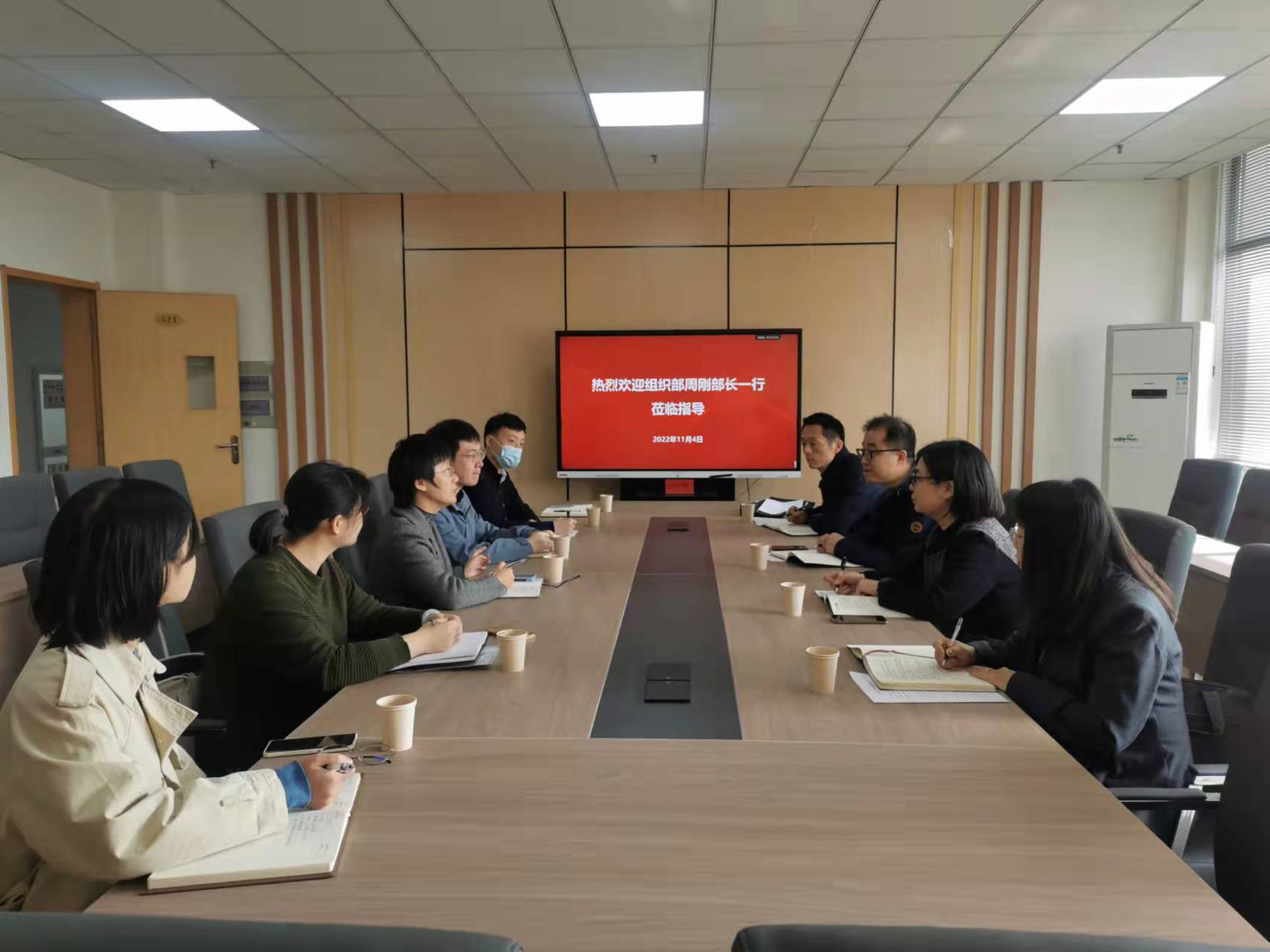 11月4日上午,党委组织部部长周刚一行来公司走访调研工作,公司党总支书记吕琳华和各支部书记参加座谈。