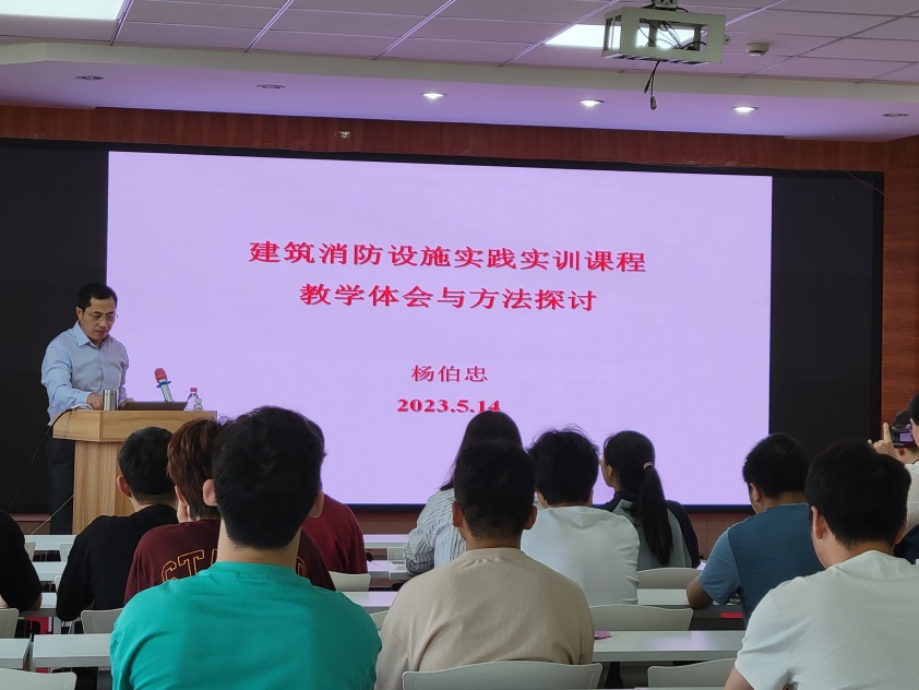 讲座围绕五个方面展开:第一,实训设施是实践教学的基础;第二,实训教师是实践教学的主体;第三,实训资料是实践教学的补充;第四,结合实物是实践教学的特点;第五,服务员工是实践教学的目标。杨伯忠分享了廊坊学院消防系统实训演练中心的设备布置及教学经验,详细介绍了火灾自动报警系统、灭火系统、防排烟系统、防火分隔构件及消防电动装置等的教学方法及体会。