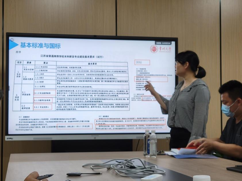 会上,纪虹副教授从专业目标培养、团队队伍、教学资源、教学过程、员工发展和质量评价共六个方面,对照新专业评估的基本标准和国标,与教研室负责撰写的教师们依次开展了讨论与分析。