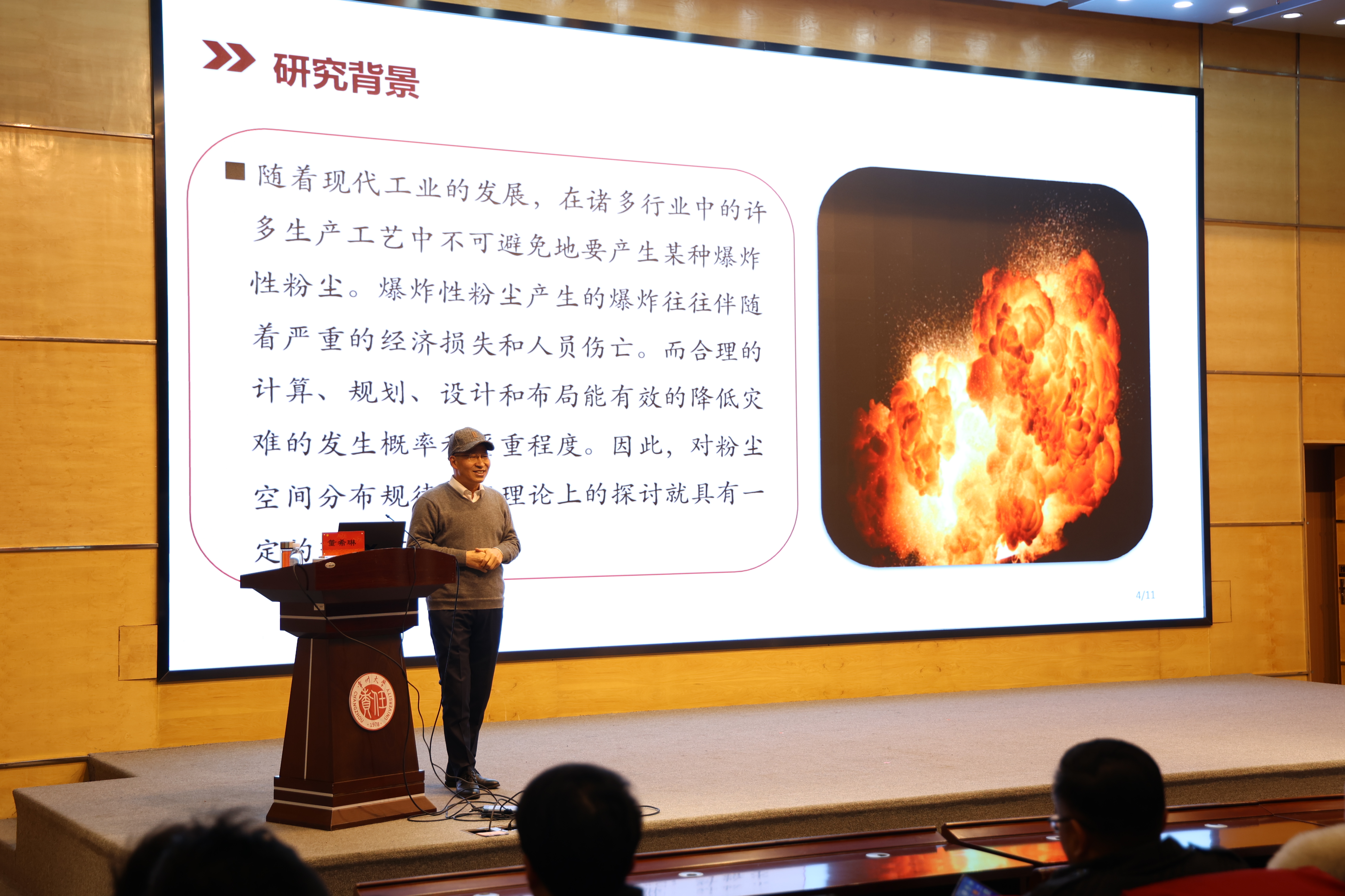 讲座伊始,董希琳由粉尘爆炸的三个条件之一:粉尘悬浮于空中与空气混合到爆炸浓度,探讨了“粉尘是如何悬浮在空中”的问题,引出了细微爆炸粉尘在空间的分布规律,展开了学术分享。董希琳讲解了影响粉尘粒子在空间分布的因素,详细阐述了包括粉尘粒子体积、粉尘密度及粉尘的“沉降平衡”状态在内的多种因素的影响过程,最后对探讨粉尘粒子分布规律的重要性进行了强调:在工业生产中,粉尘爆炸往往伴随着严重的经济损失和人员伤亡。