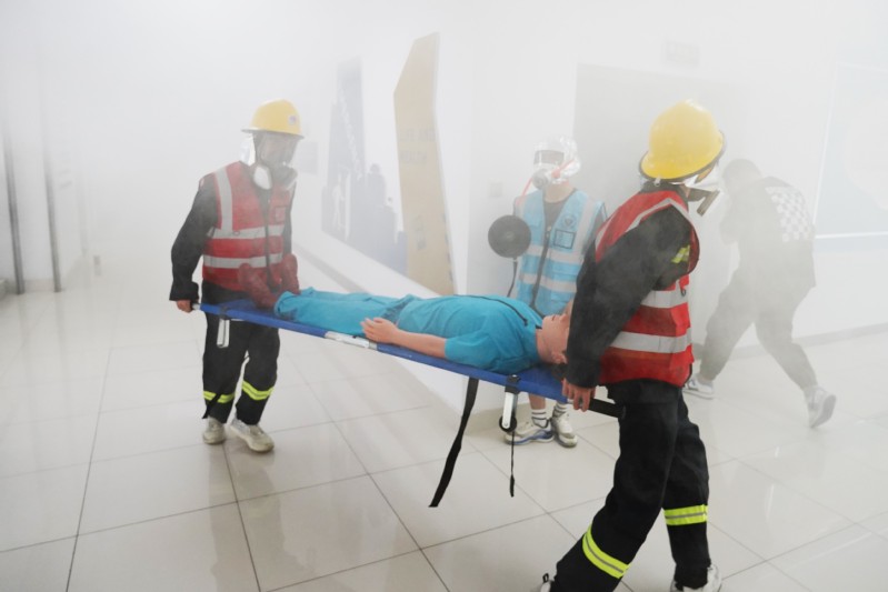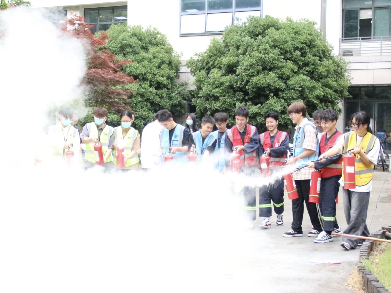 本次演练内容包括事故情形模拟、人员疏散、油盆灭火。下午14:30演练正式开始,参演师生模拟事故情形,之后随着火警发出后,参加演练的师生在在疏散引导小组成员的带领下,沿安全出口标识指向,穿过烟雾弹的迷雾,低势、快速、安全有序地疏散到楼外安全区;抢险救援组穿戴消防服和防毒面具进入火场救助被困人员,同时使用消防水带进行火灾控制;医疗救护组及时对受伤人员进行包扎和心肺复苏;通讯联络小组及时将火场消息第一时间通知学院安全领导小组。15:10所有人员全部疏散完毕后,演练结束。