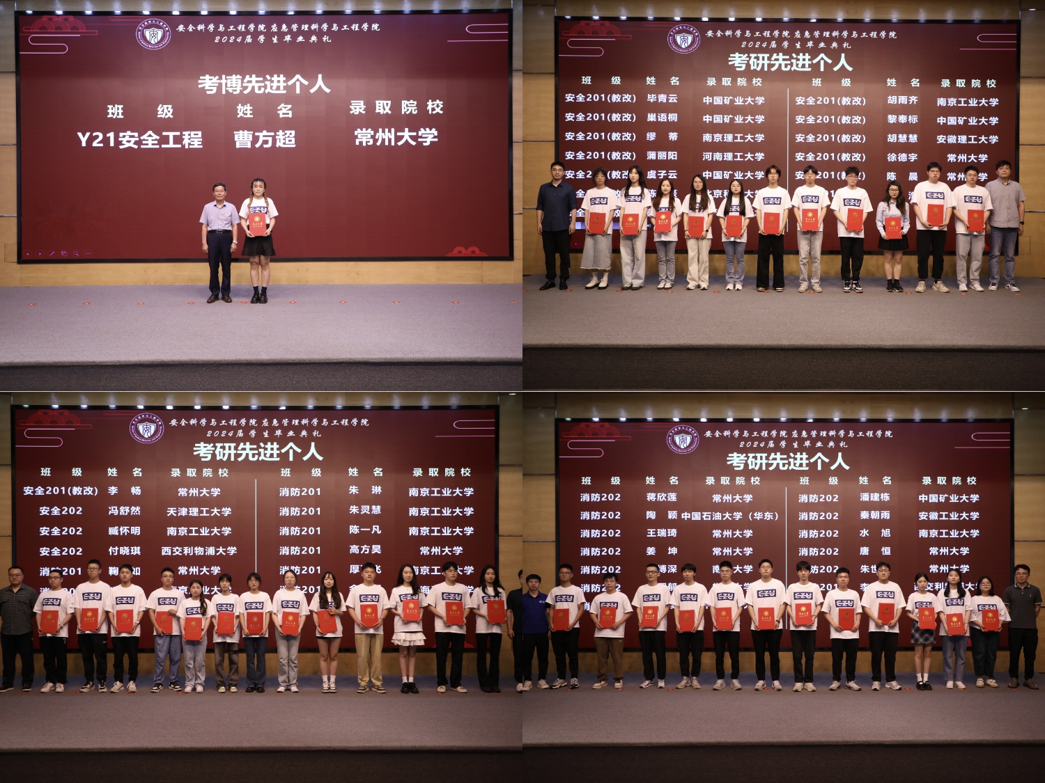 今年,公司有12名毕业本科生获评2024届校优秀毕业生,11名毕业本科生获评校优秀毕业生标兵,2人获评校优秀毕业研究生,39人获评考研先进个人,1人获评考博先进个人。此外,安全201(教改),消防202获评考研先进班集体。