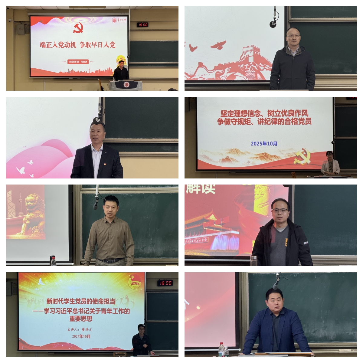 10月20日至10月29日,在集中授课阶段八位主讲教师分别围绕理想信念、入党流程、入党动机、党的性质、作风建设、党章解读、青年使命、纪律规矩等主题开展专题培训,引导学员深化理论认识、端正入党动机、强化使命担当,全面提升政治素养和党性修养。