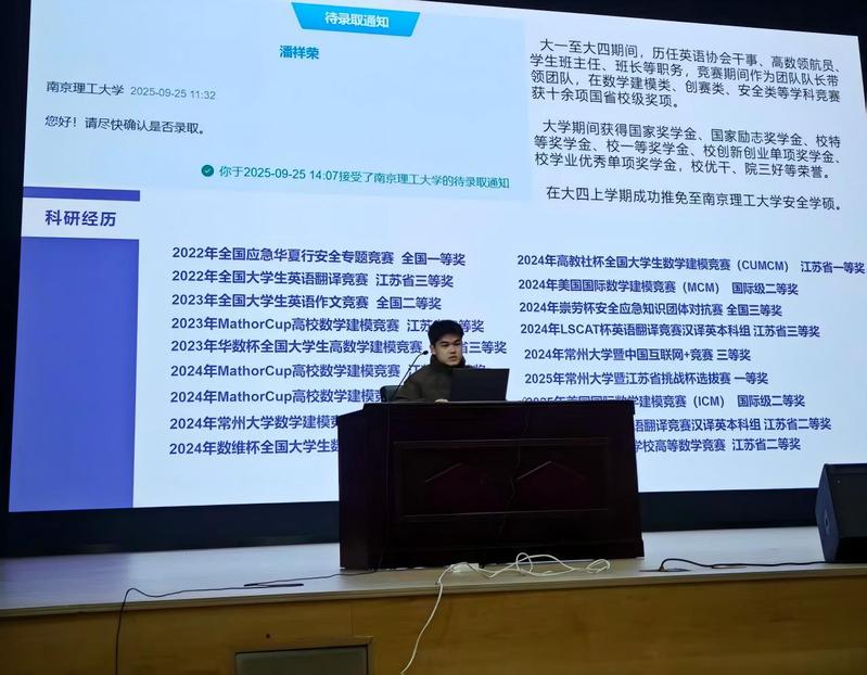 已成功保研至南京理工大学的潘祥荣同学,凭借在全国应急华夏行安全专题竞赛、全国老员工英语作文竞赛、高教社杯数学建模竞赛等多项国家级、省级赛事中斩获的优异成绩,被誉为“竞赛达人”。他展示了贯穿大学期间的丰厚竞赛成果与奖学金荣誉,并分享其核心心得:竞赛不仅是荣誉的积累,更是知识内化与能力锤炼的关键途径。他建议同学们建立“预习—听课—复盘”的稳固学习闭环,善用思维导图等工具梳理体系;同时鼓励大家主动投身学科竞赛,在团队协作与解决实际问题的过程中,让竞赛经历成为深造路上的有力支撑。